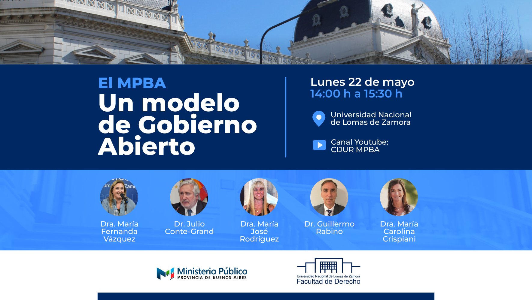 Participarán del encuentro la Dra. María Fernanda Vázquez, decana de la Facultad de Derecho de la UNLZ; el Dr. Julio Conte-Grand, Procurador General del MPBA; la Dra. María José Rodríguez, Responsable del Centro de Información Jurídica del MPBA; el Dr. Guillermo Rabino, Titular de cátedra de Derecho Procesal Civil y Comercial de la Universidad Nacional de Lomas de Zamora; y la Dra. Carolina Crispiani, Jueza del Tribunal en lo Criminal N° 4 del Departamento Judicial La Plata.