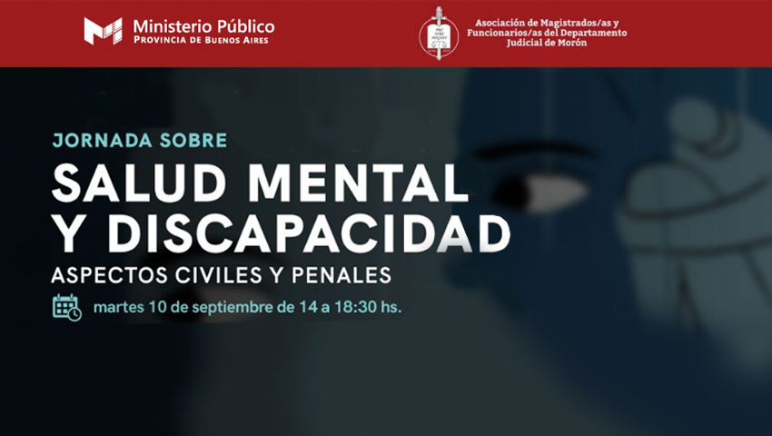 El martes 10 de septiembre se llevará a cabo, en el Salón Fermín Perera, Palacio de Tribunales del Departamento Judicial Morón, una Jornada sobre Salud Mental y Discapacidad - Aspectos Civiles, organizada por el Ministerio Público de la Defensa y las Comisiones Académicas y de Discapacidad de la Asociación de Magistrados y Funcionarios del Departamento Judicial Morón (AMFM)