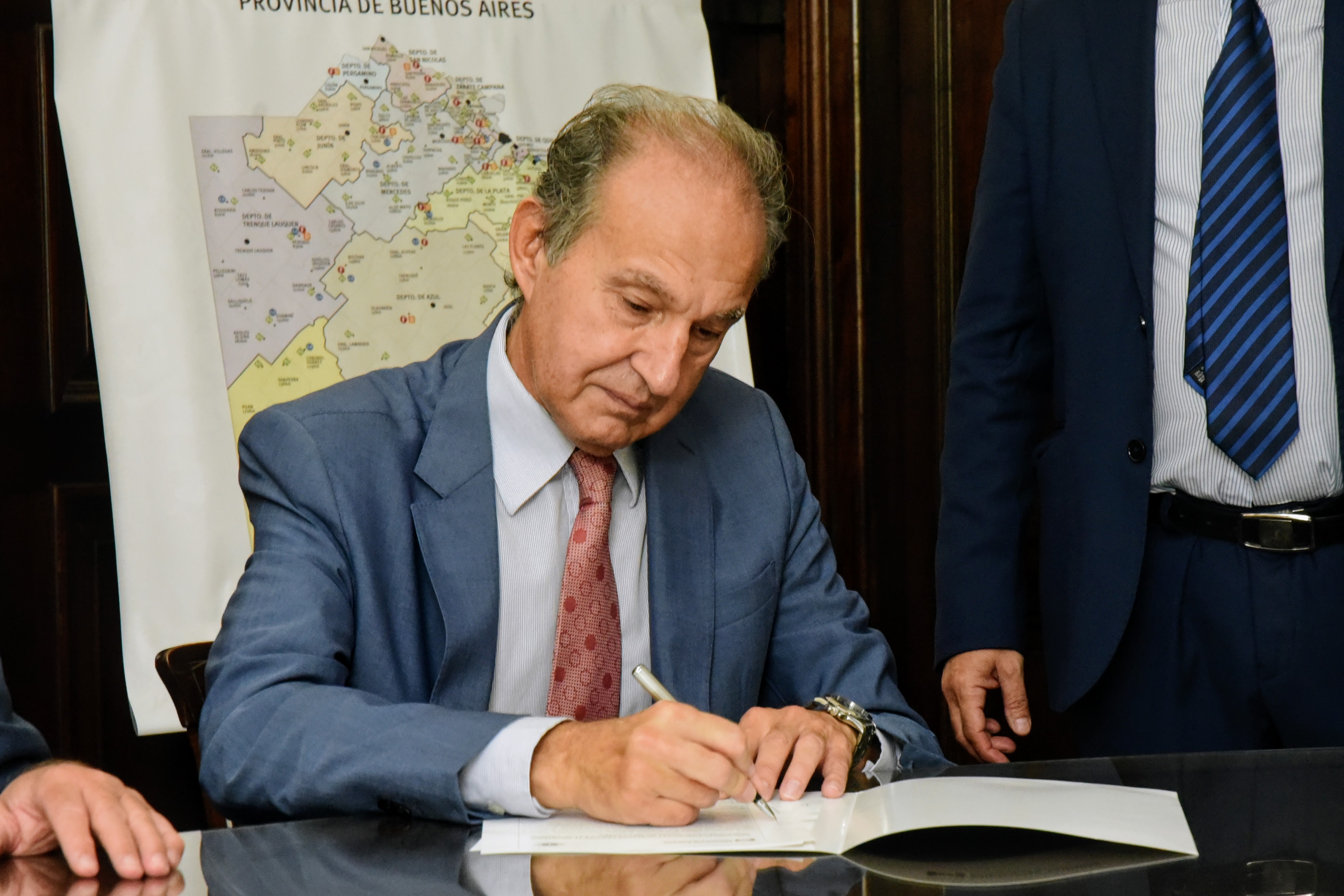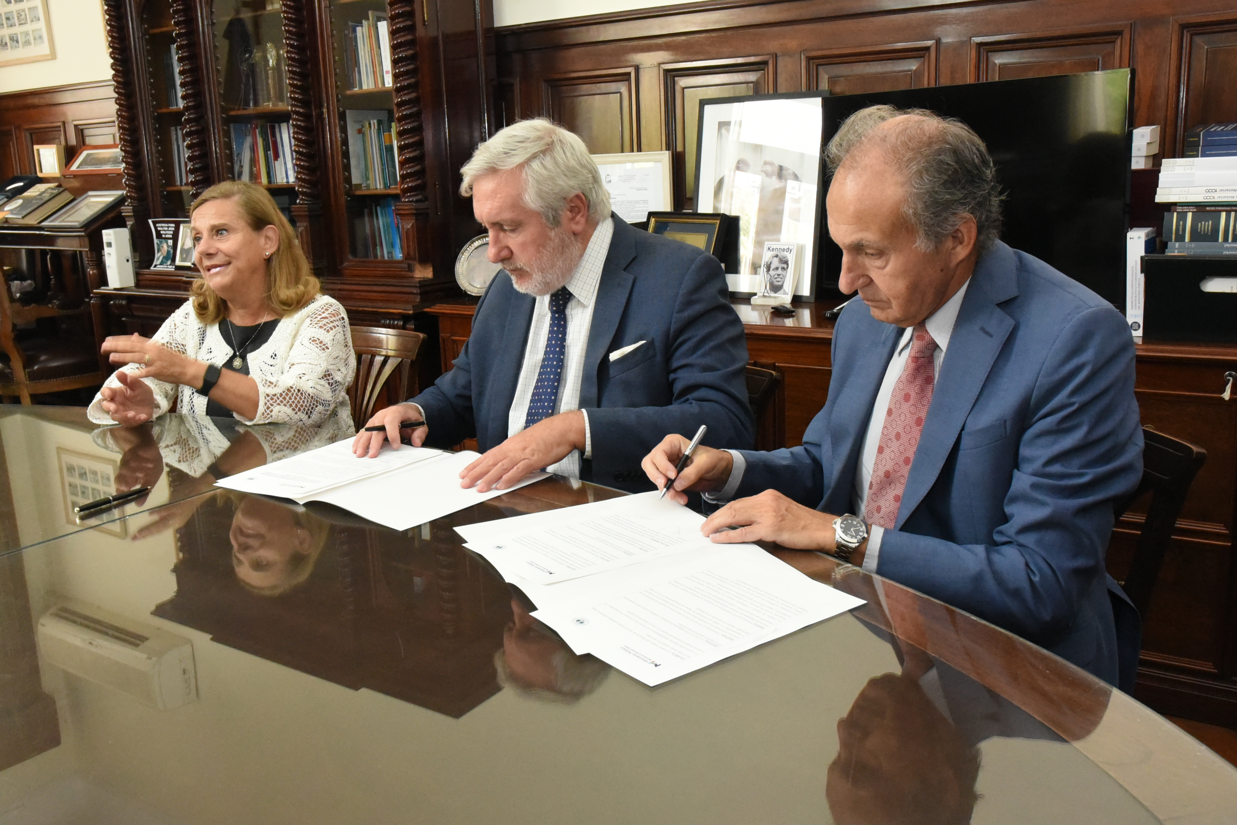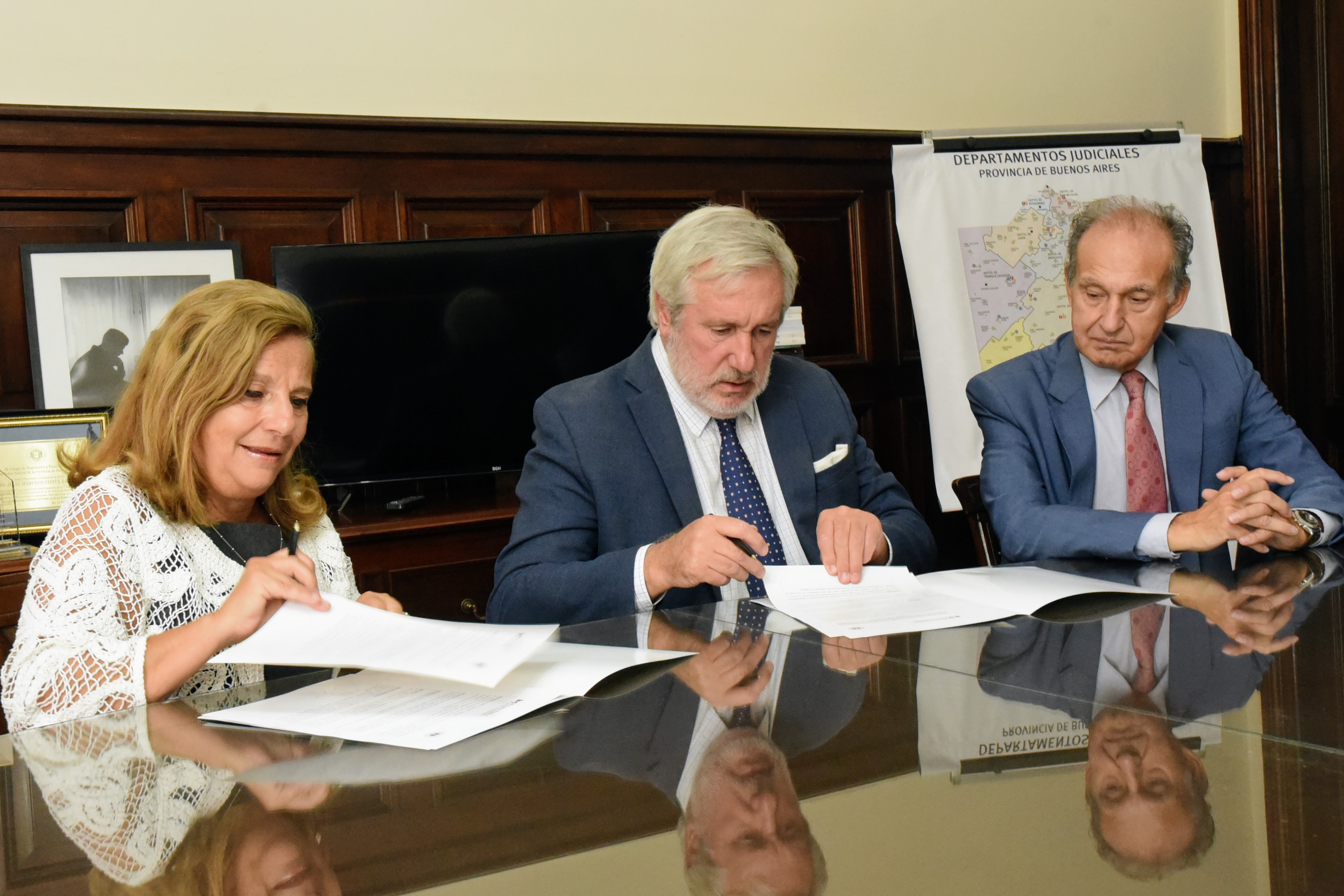 El Procurador General, Dr. Julio Conte-Grand; la Rectora de la Universidad Católica de la ciudad de La Plata (UCALP), Dra. Rita Marcela Gajate; y el Decano de la Facultad de Derecho y Ciencias Políticas, Dr. Miguel Gonzales Andia, firmaron un convenio de prácticas estudiantiles.